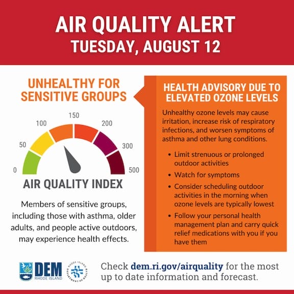 PROVIDENCE, RI – The Rhode Island Department of Environmental Management (DEM) has issued an Air Quality Alert warning air quality will be unhealthy for sensitive groups due to elevated ground-level ozone on Tuesday, Aug. 12. The alert is being issued statewide.