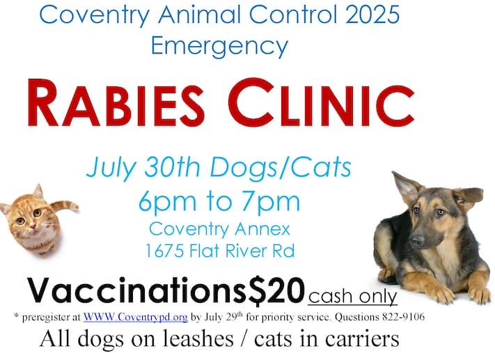 COVENTRY, RI – Due to the positive rabid cat located in Coventry last week, Coventry Animal Control will be hosting an Emergency Rabies Vaccine Clinic for pets at at the Coventry Town Hall Annex July 30, 6 – 7 p.m.
