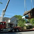 Early Saturday, a crew, crane, and two trucks from Bay Crane Northeast set up in front of Anya Martira’s Warwick home, carefully lifted the treehouse in four sections out of her back yard and onto a large flatbed. Then they drove the treehouse across the city to to be re-assembled at the daycare center on Messer Street.