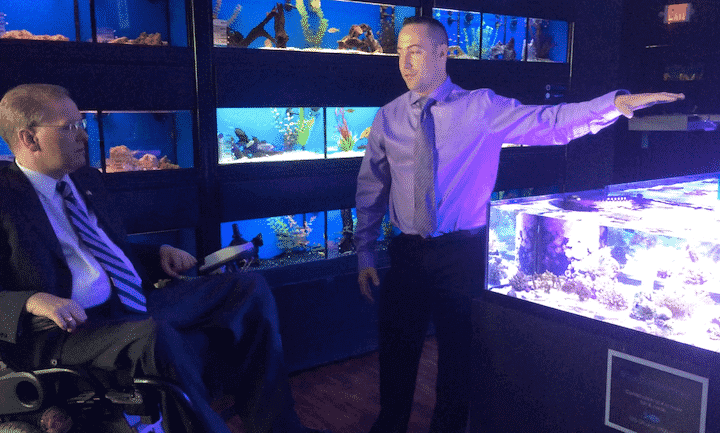 Warwick, RI – Congressman Jim Langevin visited Something Fishy Aquarium Services on Jefferson Boulevard May 8, learning about entrepreneur Kurt Harrington’s unique business plan and new partnership with Jordan’s Furniture.