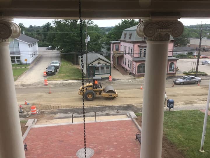 The floor shook inside City Hall on the second floor Friday as a road roller packed dirt on the side of Post Road in front the building. Outside, the roller sent heavy vibrations through the sidewalk as well.