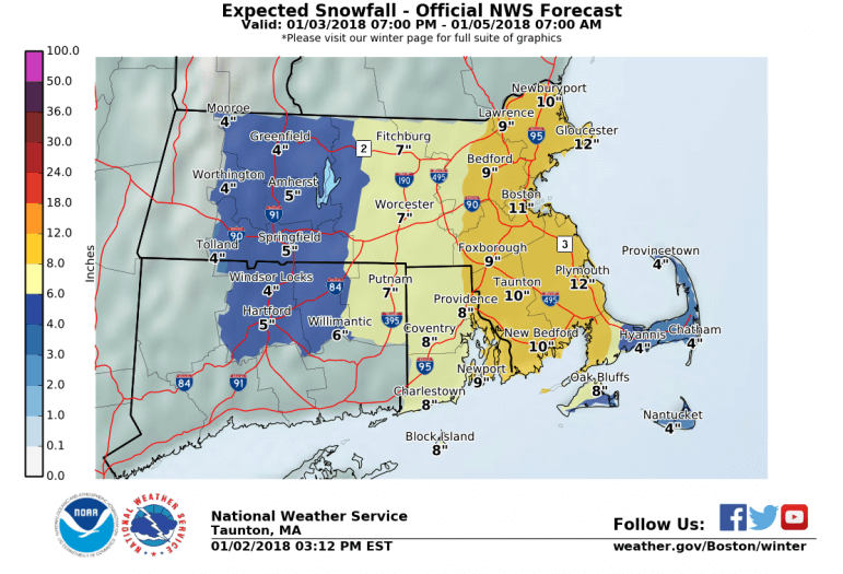 The high wind watch is in effect from Thursday morning till Thursday night. The winter storm watch remains in effect from late Wednesday night through late Thursday night. Portions of eastern, northeastern and southeastern Massachusetts and northern and southern Rhode Island are expected to receive about 8-12 inches of snowfall during the storm, according to the forecast.