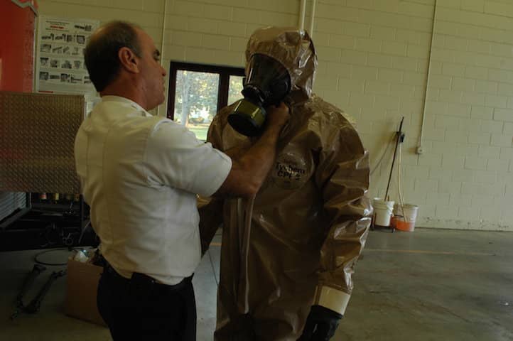 Colantonio and Erban demonstrated the donning and doffing of the protective gear. Both processes require at least three people: the responder, a helper and one observer to make sure nothing is overlooked, Colantonio said.