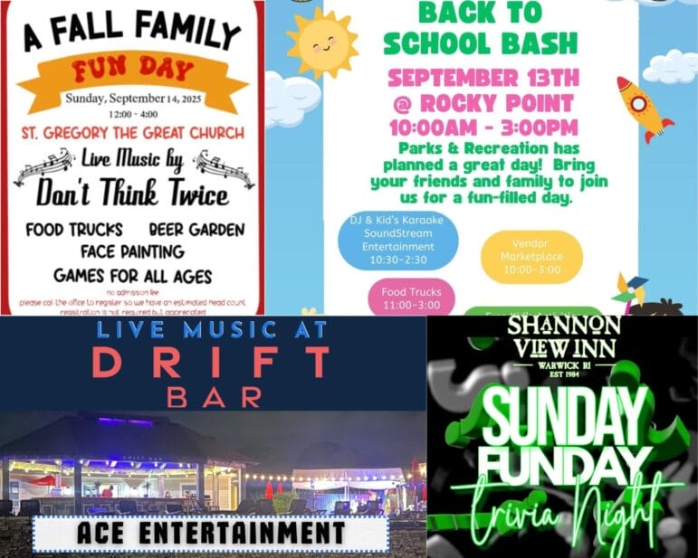 WARWICK, RI — This Warwick weekend events roundup has something for the whole family, featuring Fall Family Fun Day and Rocky Point’s Back to School Bash, along with Paws in the Park and several fun music opportunities.