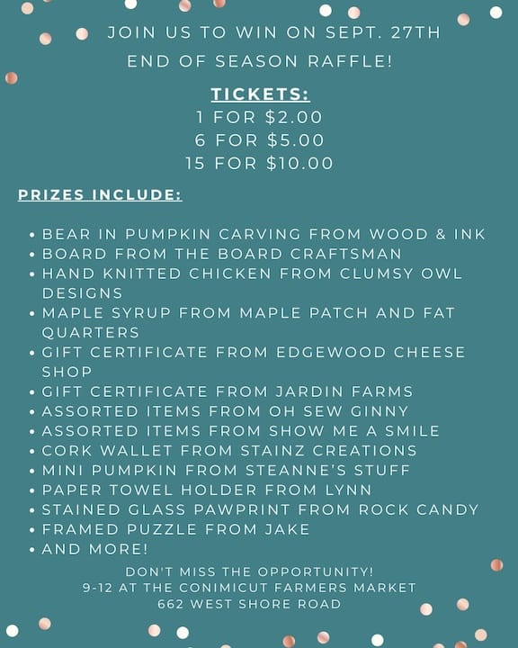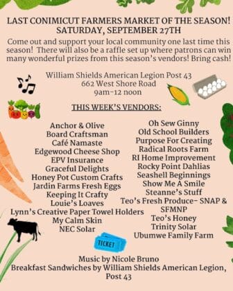 Conimicut Village Farmers Market Come to the season’s last local farmers market every Saturday morning 9 a.m.-12 p.m. at William Shields American Legion Post 43, 662 West Shore Road. Enjoy fresh, locally grown produce, unique handmade goods, and support small businesses in your community. It’s a great way to connect with neighbors and experience the vibrant flavors of the season. Music by Nicole Bruno, breakfast sandwiches by American Legion Post 43.