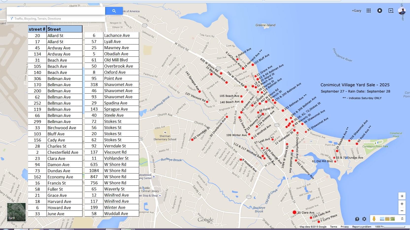 Conimicut Village-wide Yard Sale Come wander the Village and have fun during the village-wide Yard Sale 8-3. More than 60 Conimicut Village Homes will hold yard sales this Saturday. Get ready to browse and bid on items collected from closets, basements, and garages in the village. Hard copies of this map will be available at the corner of Beach Ave and West Shore Road – church side – by 7 a.m. on Saturday.