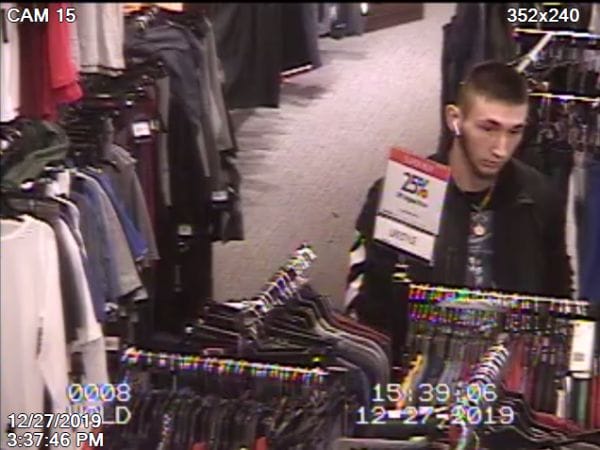 In a Facebook post on Jan. 6, the department posted two surveillance photos, dated Dec. 27 at about 3:30 p.m., of a white male who police say took about $550 in merchandise from the store. The man is shown wearing a black jacket and a necklace with a round gold-colored medallion, and is also shown with white cordless earbuds.